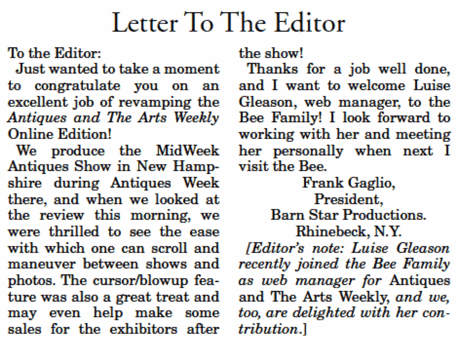Website Manager September 2016: Reference Letter, Website Manager September 2015: Acknowledgement in Antiques And The Arts Weekly Like Loading...